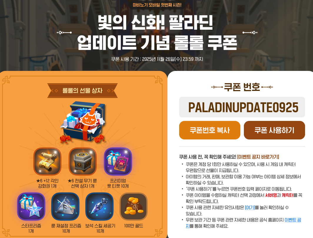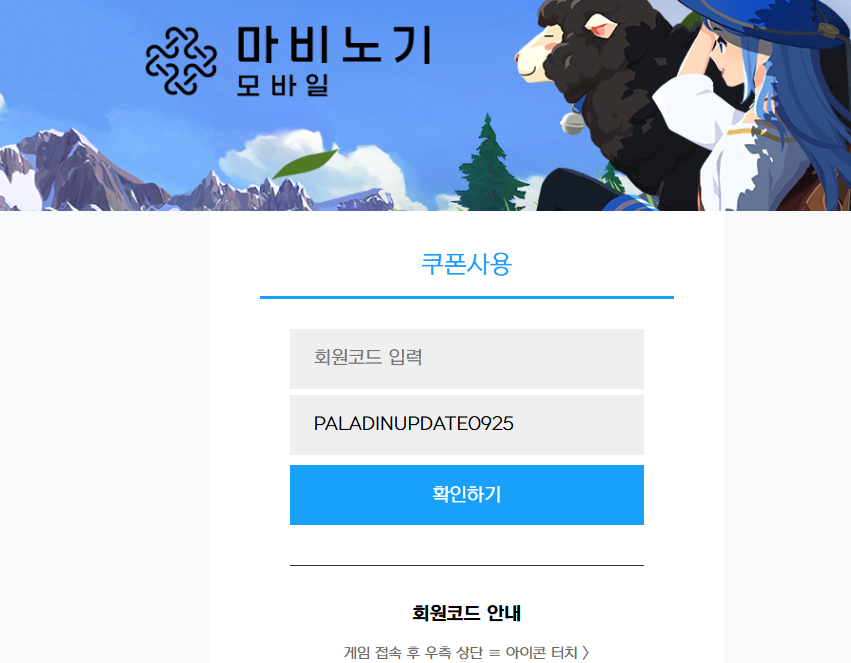 마비노기 모바일에서 팔라딘 업데이트를 맞이해서 쿠폰 번호를 공유합니다!